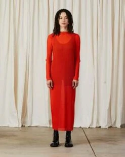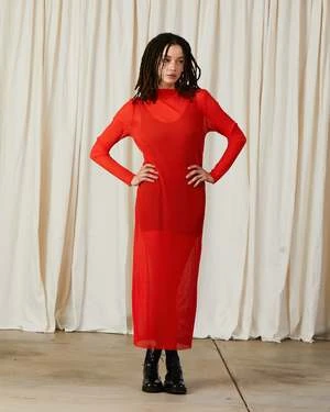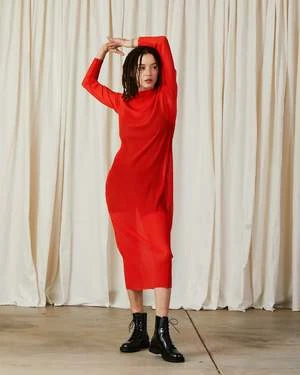 Sheer long sleeve midi dress made from stretch pleated mesh.