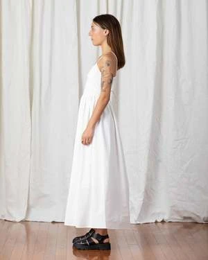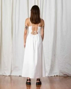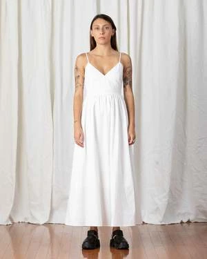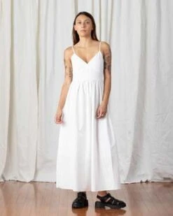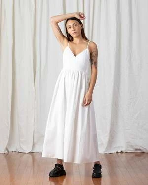 Flattering v-neck dress with fitted bodice and full maxi skirt. Adjustable tie-back closure with elastic at lower back and adjustable spaghetti straps. Fully lined.