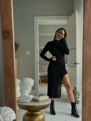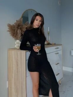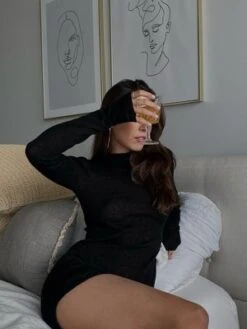 Jersey knit Mini long dress in Alpaca, long sleeves with thumbhole. An easy to style dress for day and night.