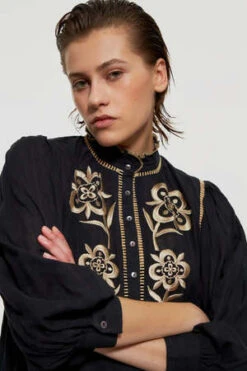 Celebrate with a bohemian flare. This low-key mini dress features beautiful in-striping throughout the fabric with a custom hand stitched floral embroidery using a tan thread with just a hint of natural luster. Mother of Pearl buttons. Voluminous 3/4 length sleeve. Comes with a slip so you can pick between full coverage or a daring, slightly sheer look. Designed in Paris and made by family artisans in India.