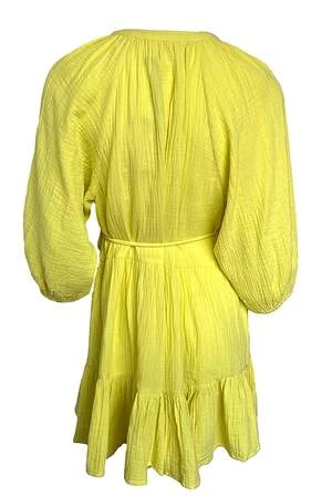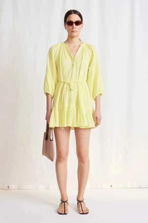 This dress from Apiece Apart features an A-line tiered skirt, subtle puff sleeve, top-to-bottom button closure, and a removable belt.
