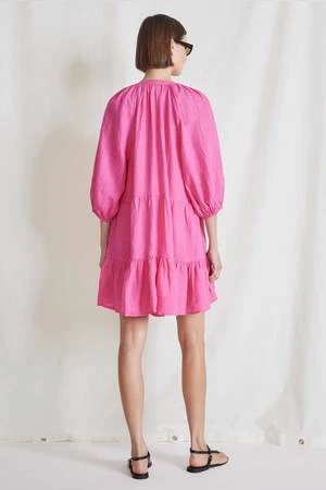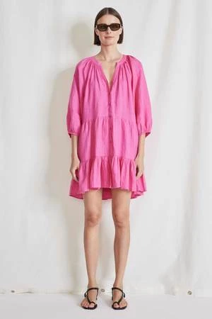 A-line tiered skirt, subtle puff sleeve, top-to-bottom button closure