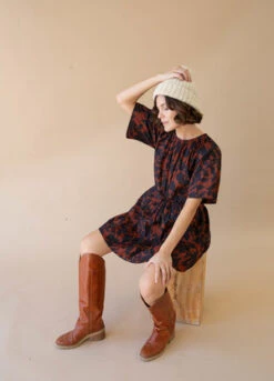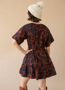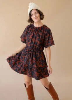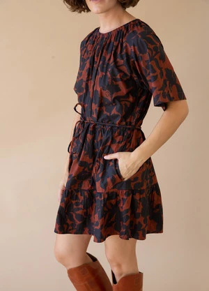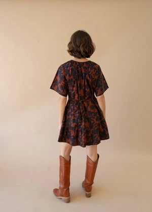 Gathered ruffles at neck, front snap closure, slight puff-sleeve with elastic at cuff, delicate gathers at the waist, single-tiered skirt