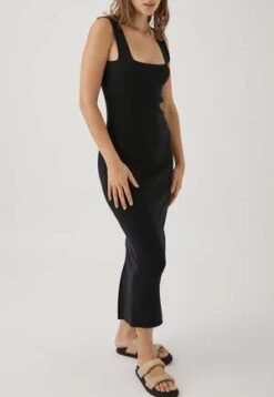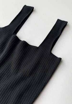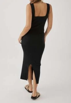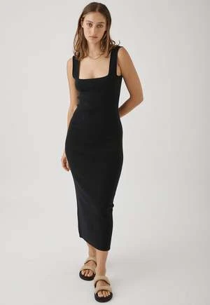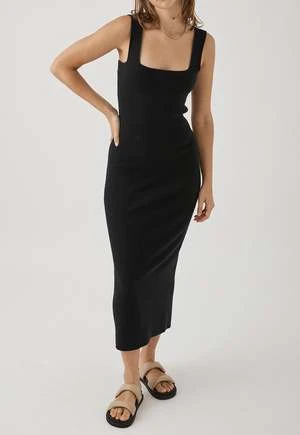 Square neck line dress with ribbed detail and back hem split. Soft hand feel.