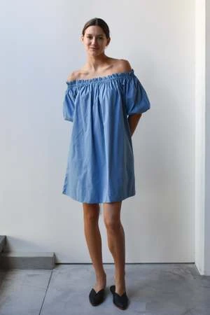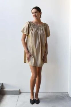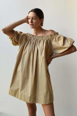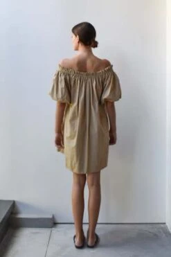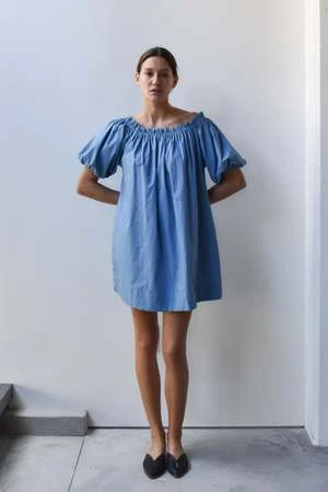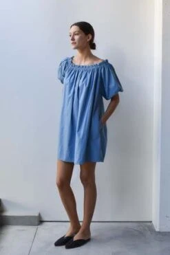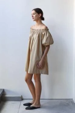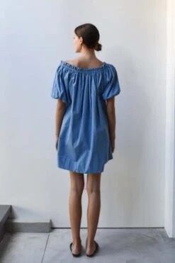 Short dress with puff sleeves and side pockets made with non-strech cotton poplin .
