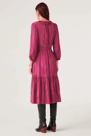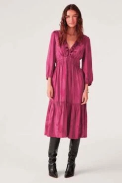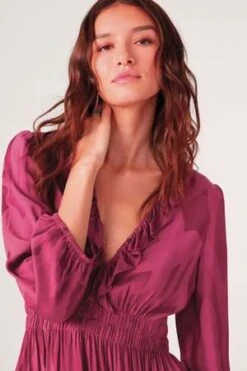 BA&SH Brina Dress in Pink is a fun midi length piece to wear for any occasion. Features long sleeves, plunging V-neckline with ruffle details, high waist detailed with two elastic bands, gathers on the skirt and a side zipper closure. Wear the dress with your favorite boots for an effortless look.