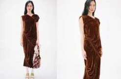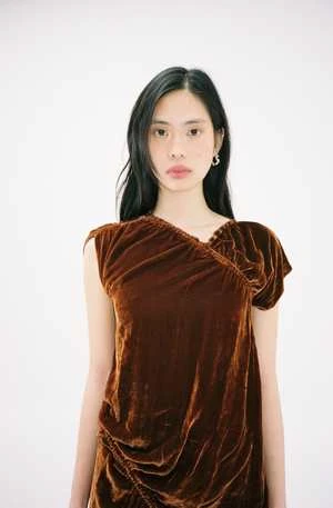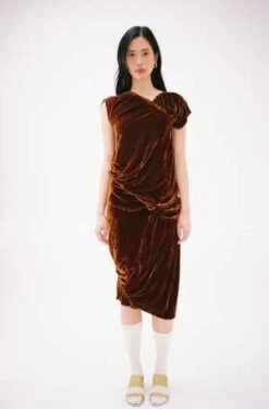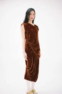 Asymmetrical velvet dress with elasticized gathered throughout. In rust brown. Made in Turkey.