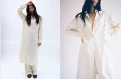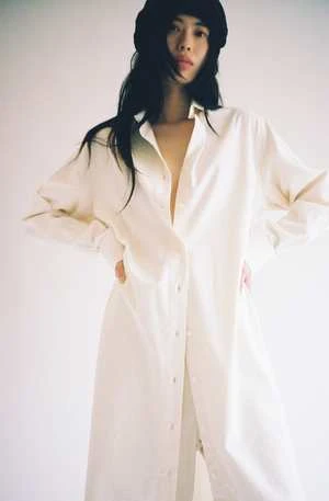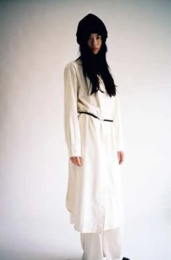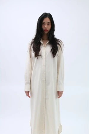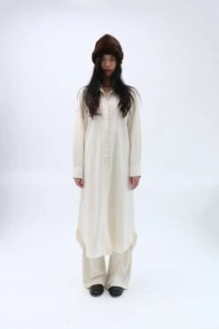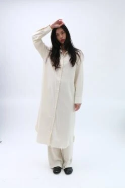 Oversized shirt dress in undyed white organic cotton. Button down front and buttons at the cuffs. Made in Tunisia. Worn over the Undyed Domond Pant.