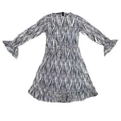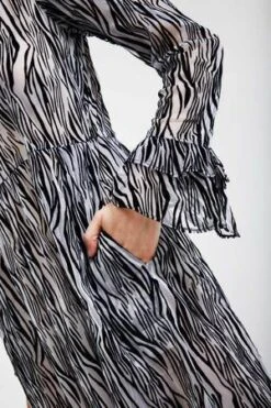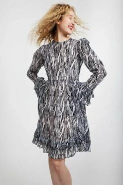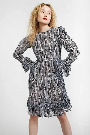 Midi prairie dress in semi-sheer mesh with black flocked zebra stripes. Round neckline. Side-seam pockets. Knee length. Zipper at back.