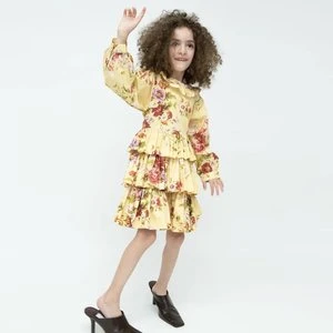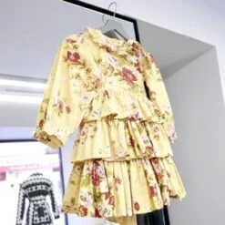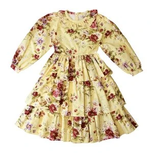 Little Girl’s midi dress with fitted bodice and triple-tiered skirt in archival Laura Ashley’s Arundel print. It features voluminous sleeves with cuffs, a ruffled neckline and a fabric tie at waist. Zip closure at back.