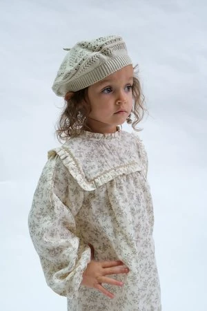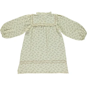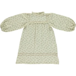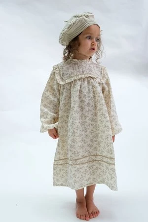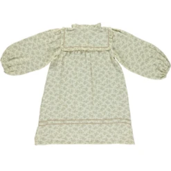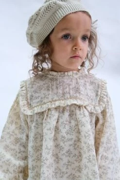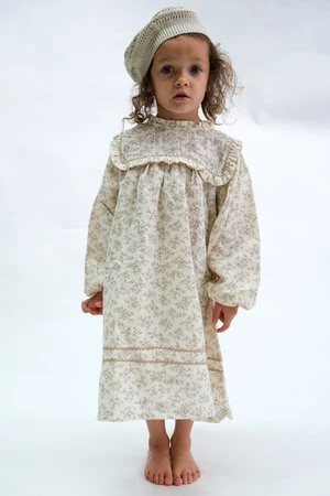 Inspired by vintage childhood memories. Crafted from soft organic cotton double gauze and trimmed with signature natural cotton zigzag rikrak. A truly beautiful silhouette with gentle ruffling at the chest and collar with balloon sleeves. Back closure with mother or pearl buttons.