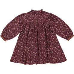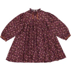 Lovely Lena dress is crafted from soft organic cotton muslin in nostalgic mulberry mini floral print. Features pouf long sleeves, elegant ruffled neckline and signature cotton zigzag tapes on cuffs and chest. Back closure with mother of pearl buttons. Truly beyond beautiful dress.