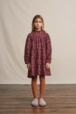 Lovely Lena dress is crafted from soft organic cotton muslin in nostalgic mulberry mini floral print. Features pouf long sleeves, elegant ruffled neckline and signature cotton zigzag tapes on cuffs and chest. Back closure with mother of pearl buttons. Truly beyond beautiful dress.