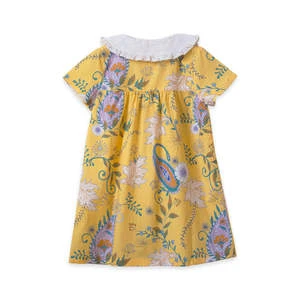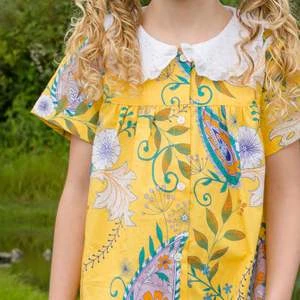 The Fae dress is a sweet straight cut dress with a gentle drape and front buttons. It features a broad collar in a white eyelet fabric and short sleeves with a slight puff. The dresses this season are in our signature bright prints in pink and yellow, both of which create a striking contrast and look lovely with the broderie collar.