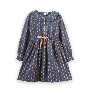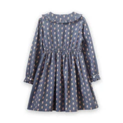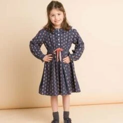 The Adelaide dress features a collar with a subtle ruffle finish that gives it a distinctive look. The waist is cinched with a sweet velvet tie at the end and adds a touch of contrast and shape to the dress. Skirt is cut wide to give many gathers and beautiful twirls. Long sleeves complete the look for a warm and cozy Autumn feel. Ages: 18 months to 10 years.