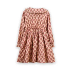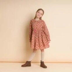 The Adelaide dress features a collar with a subtle ruffle finish that gives it a distinctive look. The waist is cinched with a sweet velvet tie at the end and adds a touch of contrast and shape to the dress. Skirt is cut wide to give many gathers and beautiful twirls. Long sleeves complete the look for a warm and cozy Autumn feel. Ages: 18 months to 10 years.