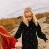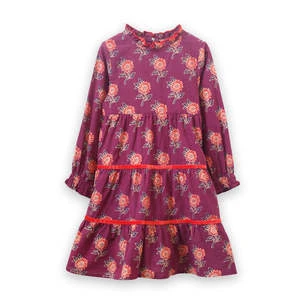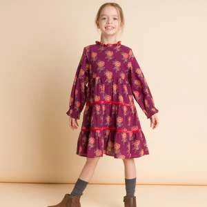 The Lily dress is a stunning look with a tiered skirt, velvet trim and ruffle detail around the neck line. The wide skirt and extra length give it dollops of charm. A back zipper makes it comfortable to get on and off. Ages: 18 months to 10 years.