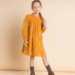 This charming dress features luxurious gathers starting from the smocked yoke for an elegant drape. There is an eye-catching trim around the neck and cuff ruffles that completes the look.