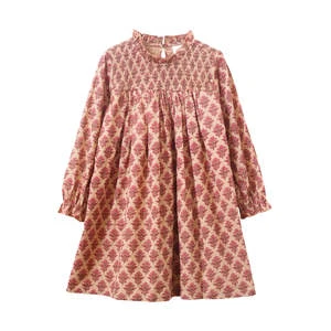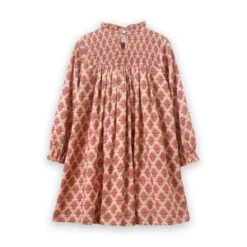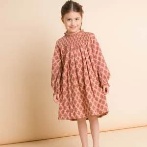This charming dress features luxurious gathers starting from the smocked yoke for an elegant drape. There is an eye-catching trim around the neck and cuff ruffles that completes the look.