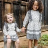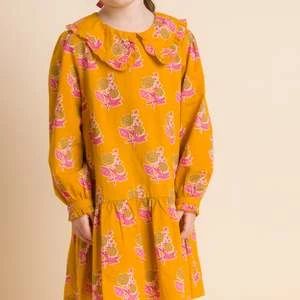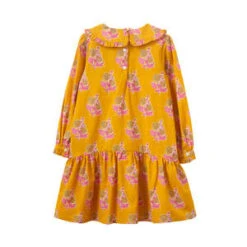 This charming dress features a lovely wide collar with a ruffle finish to frame the body. The fit is relaxed and A line and a low skirt gives it volume and bounce. Skirt has many gathers for body and twirls. A lovely dress to match the striking bright pink floral and mustard print. Ages: 18 months to 10 years.