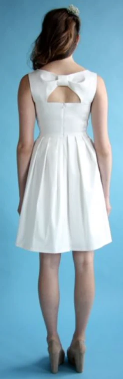 Fully lined, stretch cotton sateen dress with front tie detail and cut- out back, invisible zipper and front pockets. This style is based on the Shelduck Dress, from our FW14 collection.