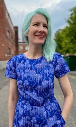 This dress has capped sleeves, pleats at the waist, front skirt pockets, and closes with an invisible zipper down the back. The body of the dress is 100% cotton, and the skirt is lined in a soft stretch satin that is 95% polyester, and 5% spandex. Shoulder to hem measures about 36″ in this style. This dress can be washed on a cold delicate cycle and hung to dry.