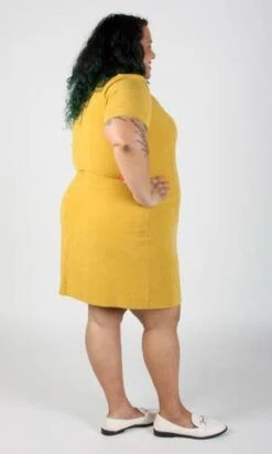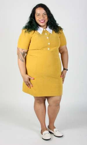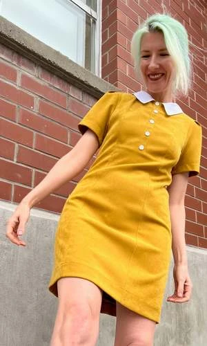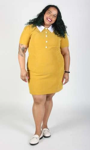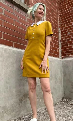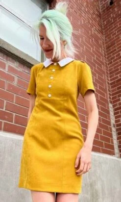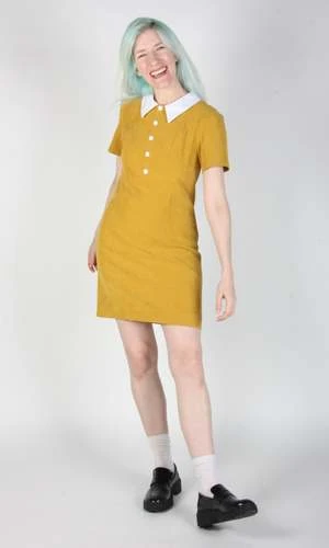 Peep is a tailored, panelled dress with a little white collar, white buttons, and short sleeves. Its fully lined in soft stretch satin, and closes with a back invisible zipper.