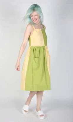 This colour-blocked, tiered shift dress is made of a soft linen/rayon blend. It slips on over the head, and has large patch pockets on the front.