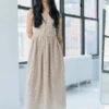 Shoulder to hem measures 35″. The exterior fabric is 100% cotton, and the satin that lines the skirt is 96% polyester, 4% spandex. This dress can be washed on a cold delicate cycle and hung to dry.