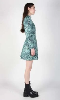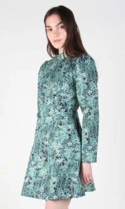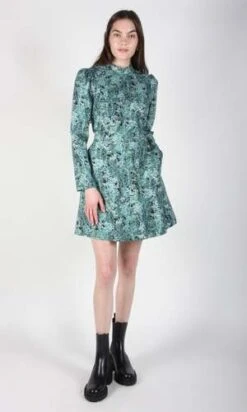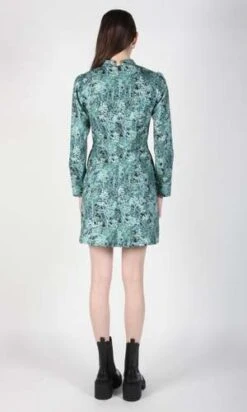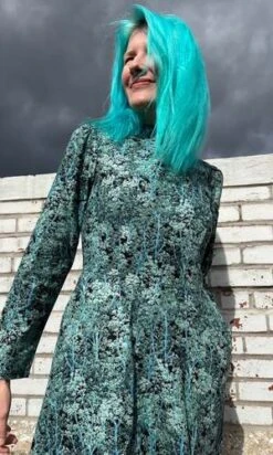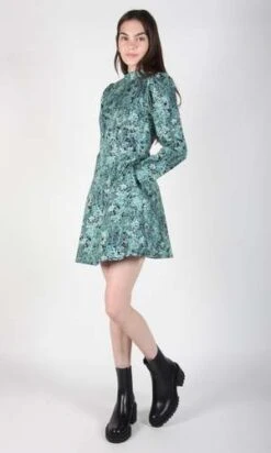 The return of Topaz! We first did this cut for the fall of 2020, and it was a huge hit! We have it for the first time again in lovely new fall prints. It has long sleeves, a standing collar and an A-line skirt. The skirt has pockets and is lined in soft satin, and the dress closes with a back invisible zipper.
