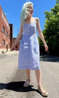 Vesper Sparrow is the epitome of breezy summer style with its playful stripes and easy fit. It’s made of a gorgeous 100% linen and is fully lined in breathable cotton voile. It has front patch pockets and the front closes with a long row of white buttons.