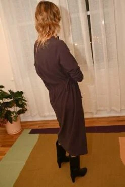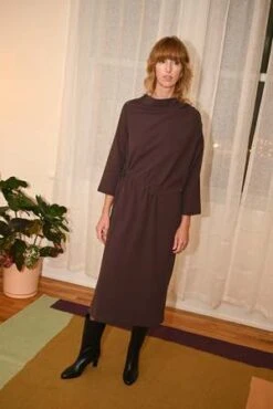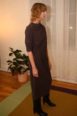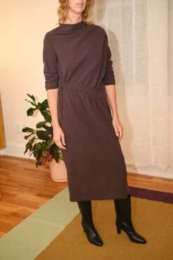 The Ruched Dress by Black Crane is all about details. Falling right around the mid-calf, Plum colored cotton is adorned with ruched detailing at the shoulder and waist, featuring a drawstring for shape versatility. An overall relaxed silhouette dons a gentle cowl neck and is topped off with quarter length sleeves, perfect for the transitioning weather. Dress the Ruched Dress up with your choice of shoe and adornment, or pair it back to your favorite loafer, boot or sneaker for a chic every-day look.