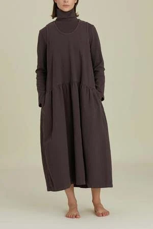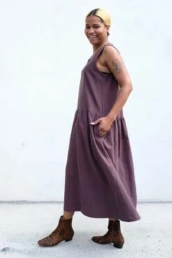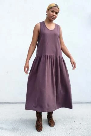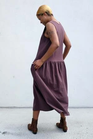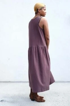 A relaxed tank dress with a scooped neck, side seam pockets and shirred detail around the waist. Cut from a soft textured 100% cotton fabric.