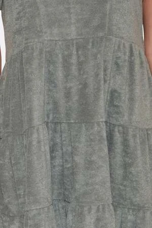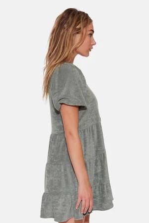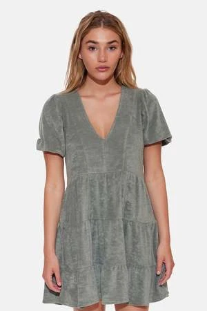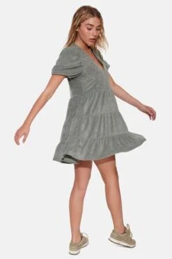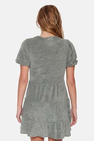Introducing the “Stassi” Terry tiered mini dress. This dress features a flattering V-neckline and puff sleeves. Pair with your favorite sneakers or strappy heels to complete the look. Add some oversized sunglasses and a wide-brimmed hat for a glamorous touch.
