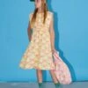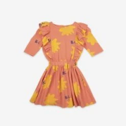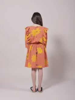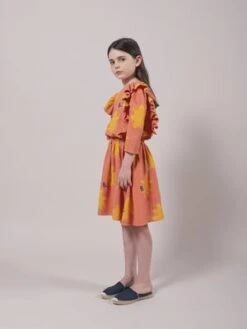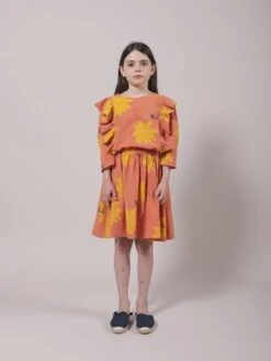New from Bobo Choses ‘For President’ collection for Spring/Summer 2021. Kid’s dress with frill trim, cinched waist and flared skirt. Fabricated in a lightly textured organic cotton with oversized sparkle illustrated print.