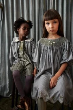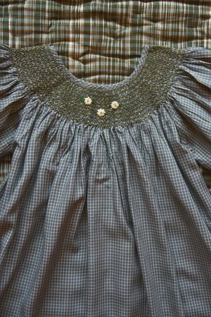 Pale blue and grey check dress with pouf sleeves, intricately smocked neckline, scalloped hem and embroidery detail.