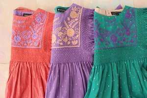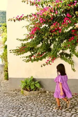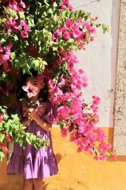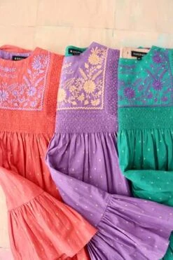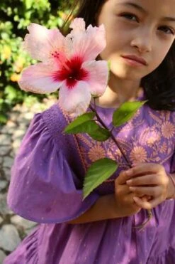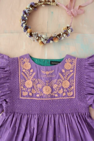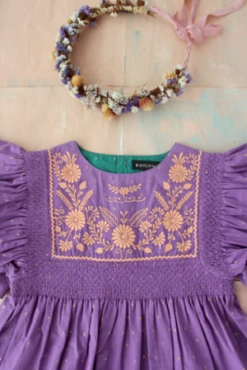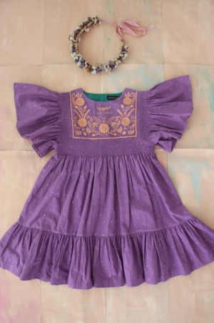 From Bonjour’s new Spring / Summer 2022 collection. Violet cotton dress with allover gold dot print. This season’s Rosalie Dress has been updated with flouncy butterfly sleeves and tiered skirt. Features elaborate pink embroidery.