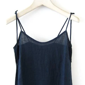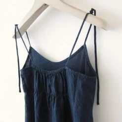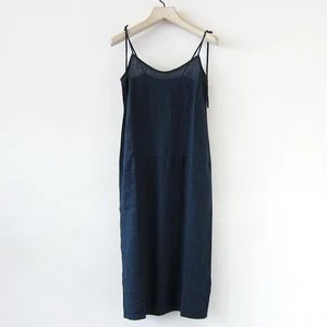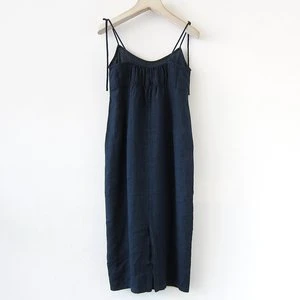 Relaxed linen slip dress featuring adjustable shoulder straps, shaping darts for a more flattering fit, hip seam detail on front, gently elasticated back yoke for flexibility, and back vent at bottom hem. Washable.
