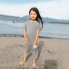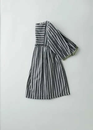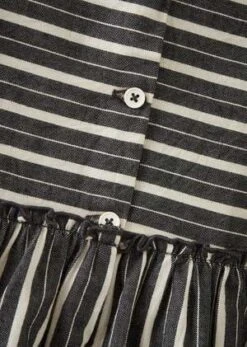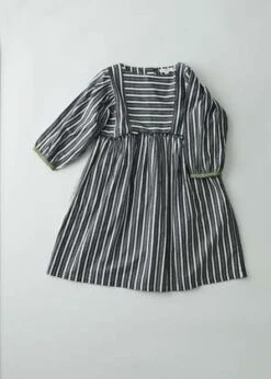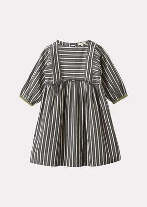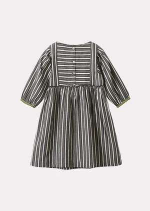 A wintery take on seaside stripes: our Celeste Girl Dress in Grey Stripe. Crafted in a Greek woven cotton, the puffed sleeves and gathering at the waist create a voluminous feel, whilst the high neck and button fastening at the back make for easy wearing. The additional panel details at the bodice elevate the stripes of dress, making it the perfect option for day to night and everything in between.