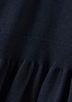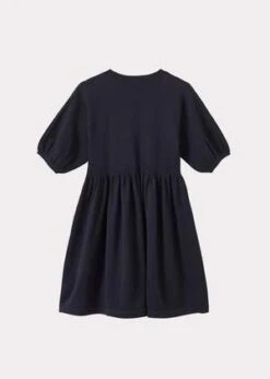 Our soybean dress in navy. Fitted through the bodice, with puff sleeves and extra volume in the skirt through soft gathering at the waist. Designed for cooler spring days. 100% cotton.
