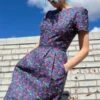 A short sleeve, full-length dress from Caron Callahan with ruching down the front and back. Features a v-neck and is slightly A-line in shape. A super flattering fit and easy to wear and layer over when the weather gets cold. Fabricated in a puckered mini-plaid fabric and unlined.
