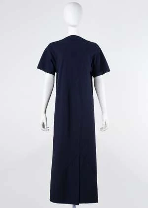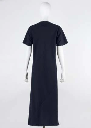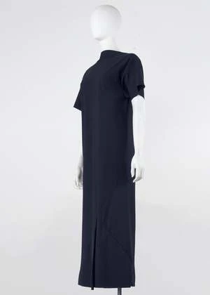 Bias cut dress in heavy crepe. Asymmetrical seams swirl around the body. Kick pleat in front. Raw edge details throughout.
