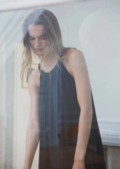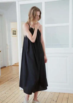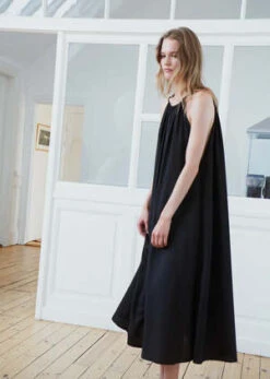 an airy a line dress with a high elastic gathered neckline and voluminous skirt, deep side pockets and a full length.