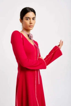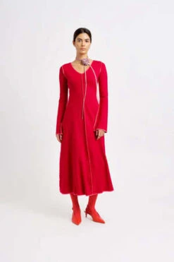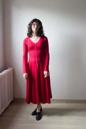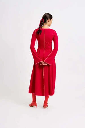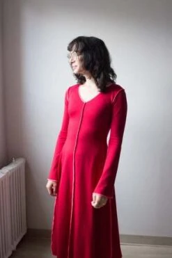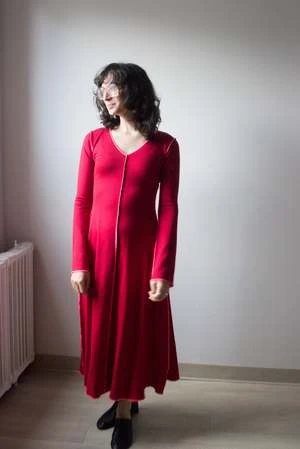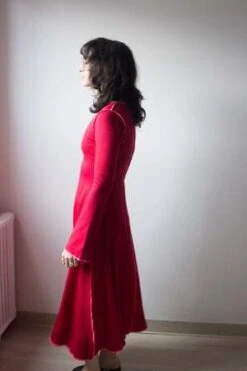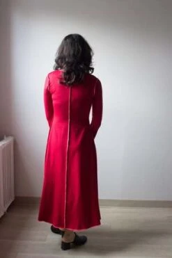 Eliza Faulkner’s Clara Dress is a midi-length, long-sleeved dress that is fitted through the bust and waist and flares out into a dramatic A-line skirt. Made with a thick black ponte fabric and contrast top-stitching, this fabric is not clingy or light but is actually thick and stretchy, giving you that ‘hugged-in’ feeling. The lovely soft v-neck makes it so that its easy to slip on over your head and accessorize as you please! Pair it with chunky boots and you’re good to go!