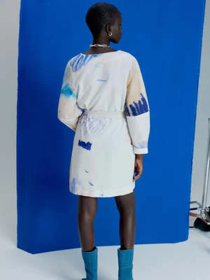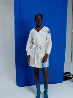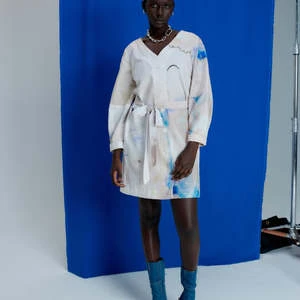bove-the-knee dress made from a 50% cotton and 50% viscose OEKO TEX blend. A belted waist, two side pockets and a button placket, it’s a very versatile dress to accessorize for a casual or elegant style as desired. Slightly balloon sleeves, elbow seam and turn-up at the wrist. Please note that the pieces are unique and may not conform to the image.