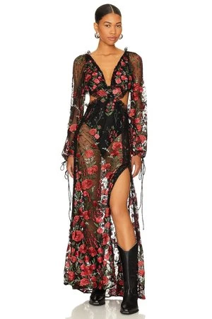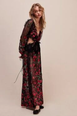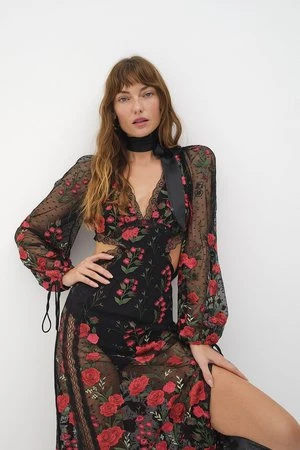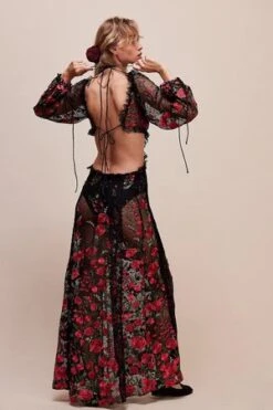 – Cascading rose embroidery.