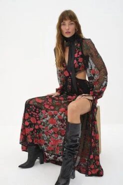 Belle of the ball. Ready for any special event in the most romantic style, this floral-printed maxi dress features cutout detailing at the sides, sheer piecing throughout, and a super strappy back for an added special touch.