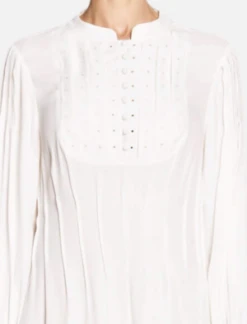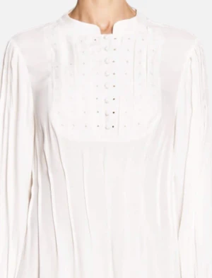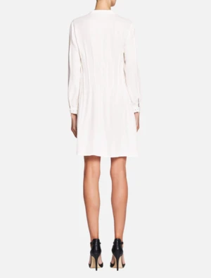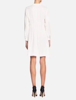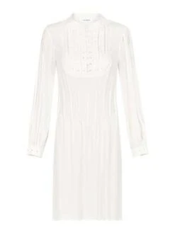 The Eyelet Pleated Dress by Frame Denim is the perfect elegant little white dress with a subtle touch of romance. Constructed from a lightweight off white viscose, this piece features pintucked pleats, eyelet details, banded collar and covered button details on the front and at the cuffs. Team this long sleeved piece with some nude heels for a dreamy and classic look.