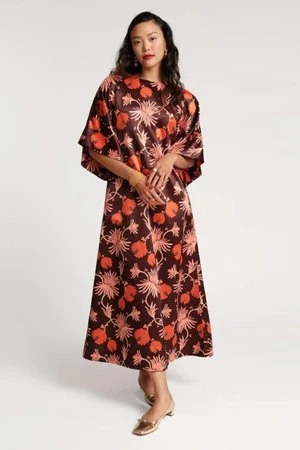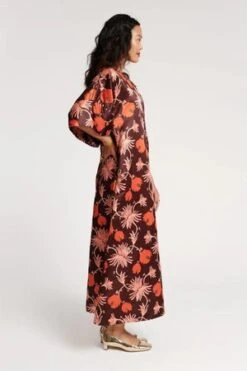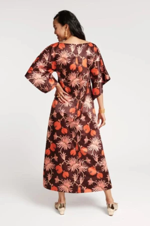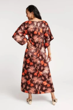 The Fantasia print is a bold hand-painted floral featuring warm-toned petals against a chocolatey backdrop, detailed with hints of turquoise.