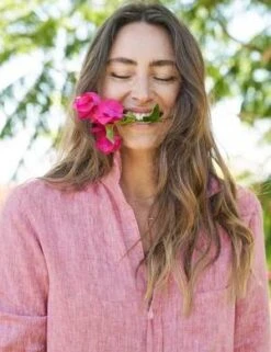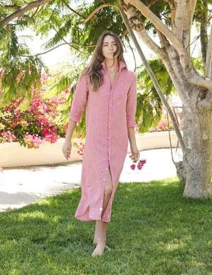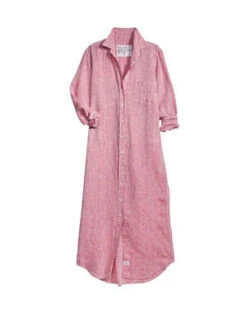 The Rory Woven Long Dress in Red Lived-in-Linen is a full length dress featuring a slimming silhouette, statement chest pocket, and full length sleeves, perfect for rolling up for a more casual effect.